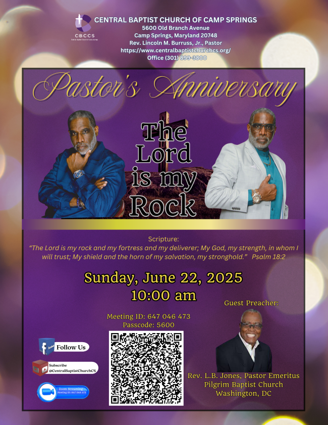 Please join us as we honor his pastorship and leadership today. Pastor Emeritus Louis B. Jones--former pastor of Pilgrim Baptist Church (DC)-- will deliver the anniversary message during the celebration.